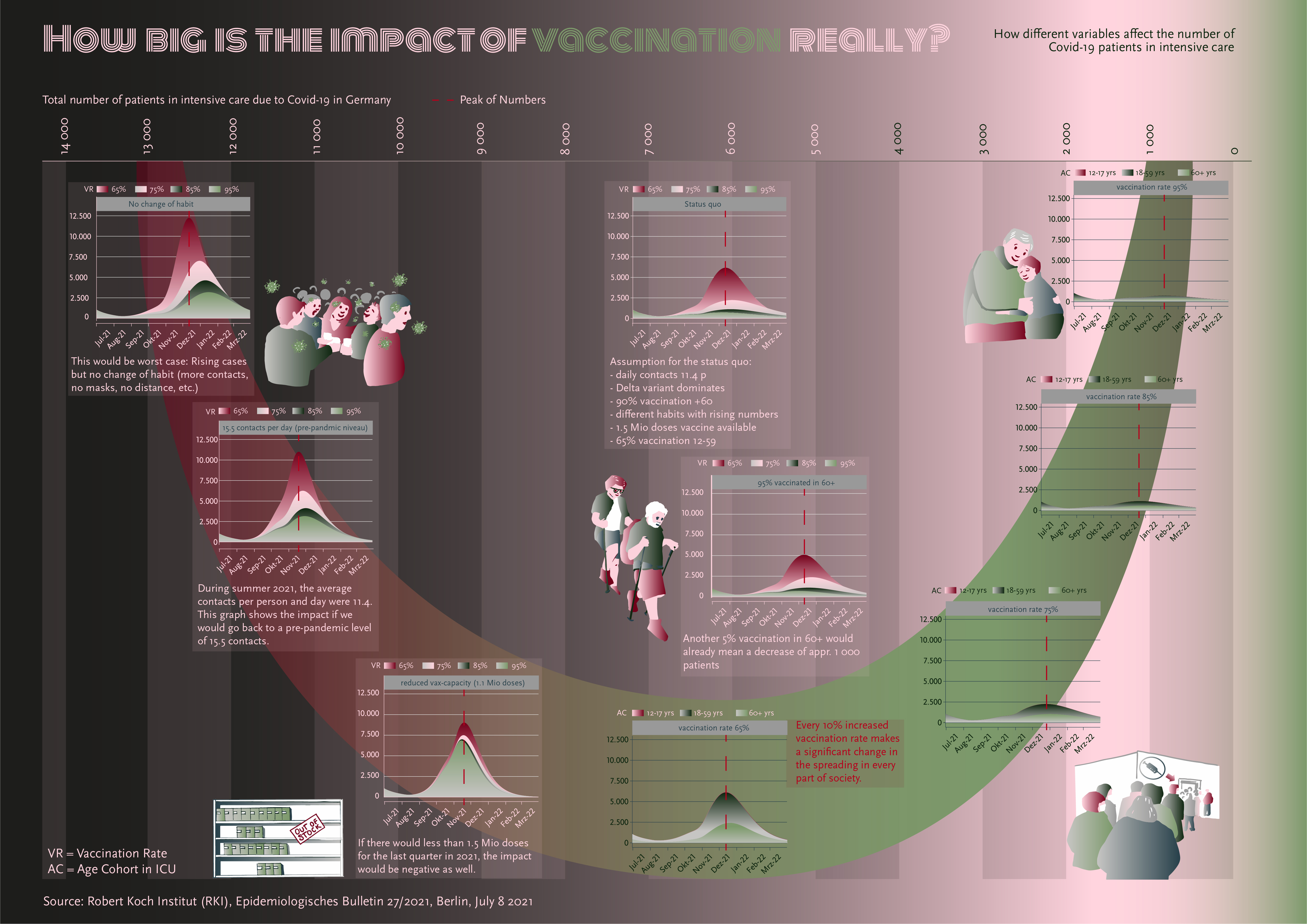 Das Robert Koch Institut publizierte bereits im Juli 2021 ein Szenario, welche Faktoren Einfluss auf die Belegung von Intensivbetten durch Covid-19-Patient*innen haben könnten. Dabei zeigt sich deutlich, wie gross der Einfluss von wenigen Prozent höherer Impfquote auf eine Entspannung der Lage sein würde.